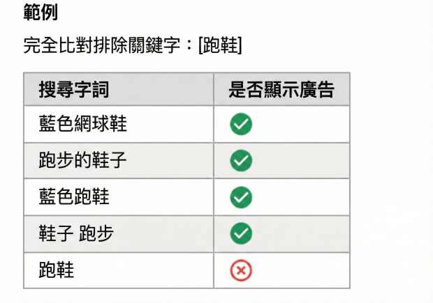 在排除關鍵字的完全比對中,關鍵字不會擴張涵蓋範圍,近似變體也不會被視為排除對象。因此,若希望僅排除完全相同的字詞,應使用此比對類型。